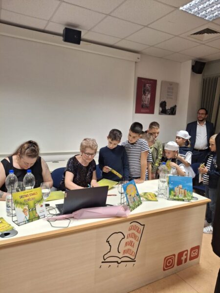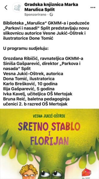 U  Središnjoj knjižnici Gradske knjižnice Marka Marulića, u Mjesecu hrvatske knjige, predstavljena je slikovnica „SRETNO STABLO I FLORIJAN“, autorice Vesne Jukić-Oštrek  i ilustratorice Done Tomić. Nastala je u suradnji GKMM-a i poduzeća „Parkovi i nasadi“ Split.